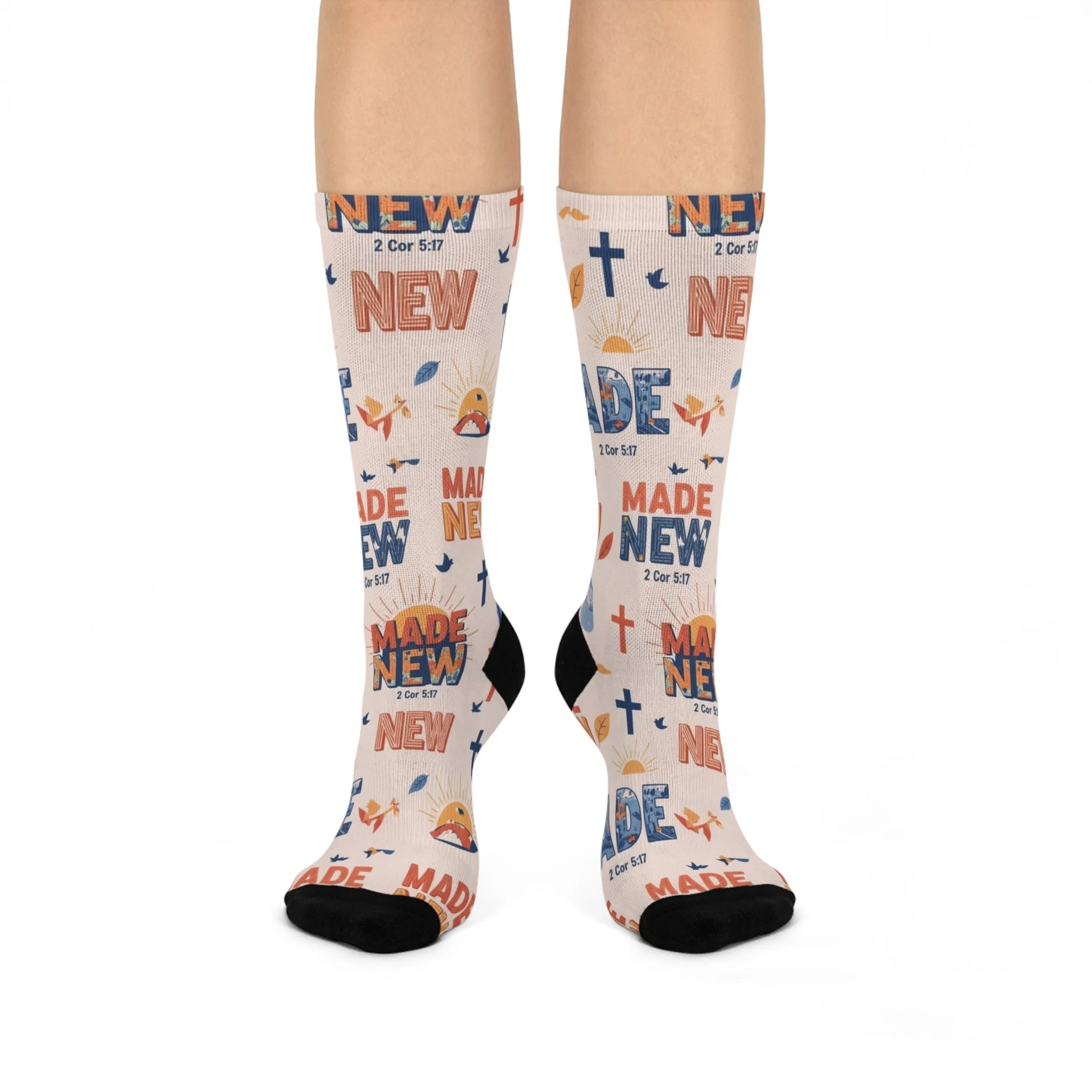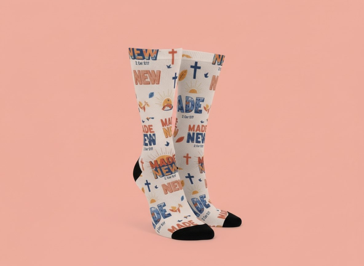 These cushioned crew socks bring bright, playful faith-forward energy to everyday wear. The all-over print wraps a soft peach background with bold navy and rust lettering reading “MADE NEW,” small cross motifs, and joyful little icons — a subtle reminder of renewal that peeks out with every step. Finished with solid black toes and heels, a 200-needle knit, and plush cushioning underfoot, they feel gentle during long days on your feet while holding vibrant color wash after wash. Lightweight stretch fibers hug the calf without binding and the one-size design stretches from women's 5 to men's 12 for a comfortable, secure fit.